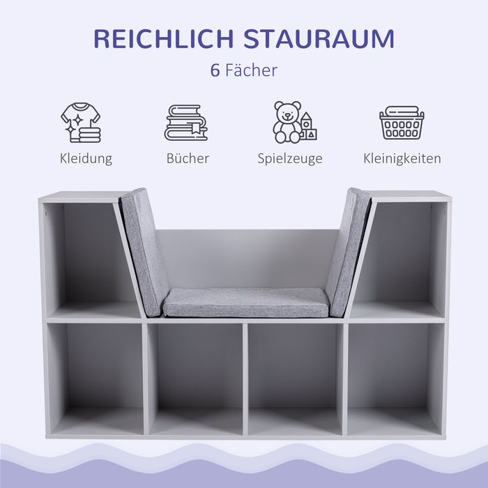 2-in-1 Kinderregal Regal + Sitzbank inkl. Polster 103 cm × 30 cm × 62 cm Weiss + Grau