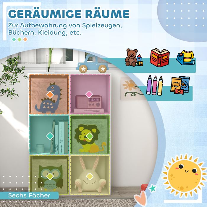 Sechs grosszügige Fächer bieten reichlich Raum, um Spielzeug und Kleinigkeiten ordentlich zu verstauen und so das Chaos zu minimieren. Dank seines stabilen Designs steht der Schrank fest und sicher, inklusive Kippschutz für mehr Sicherheit. Die Montage ist unkompliziert und schnell erledigt. Mit fröhlichen Tiermotiven im Cartoon-Stil gestaltet, bringt er Spass und Farbe in das Zimmer Ihres Kindes.