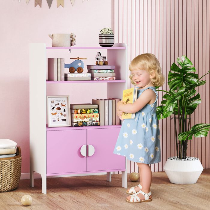 Bücherregal für Kinder, 2 Regale, 2 Schränke, freistehend, Anti-Kipp-Design, rutschfeste Füsse, MDF, Rosa+Weiss