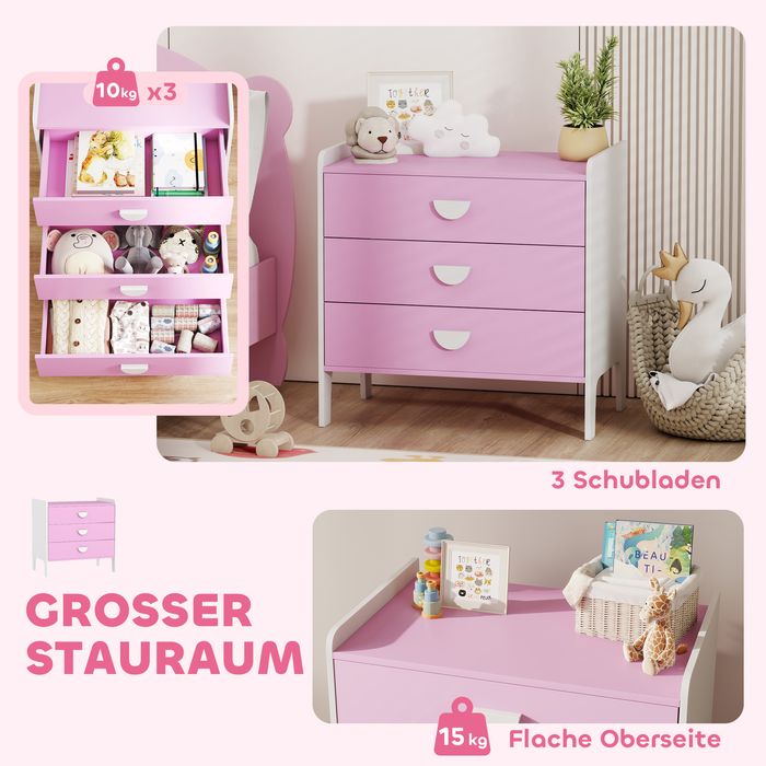 Kinder-Kommode mit 3 Schubladen, MDF, Aufbewahrungsschrank für Kinder, Rosa+Weiss