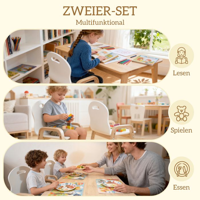 - Sicher und stabil: Aus starkem Birkenholz gefertigt, mit stabilen Armlehnen für zusätzliche Unterstützung, tragen diese Kinderstühle bis zu 80 kg. Rutschfeste Fusspolster schützen den Boden und sorgen für zusätzliche Stabilität, was Eltern beruhigt.