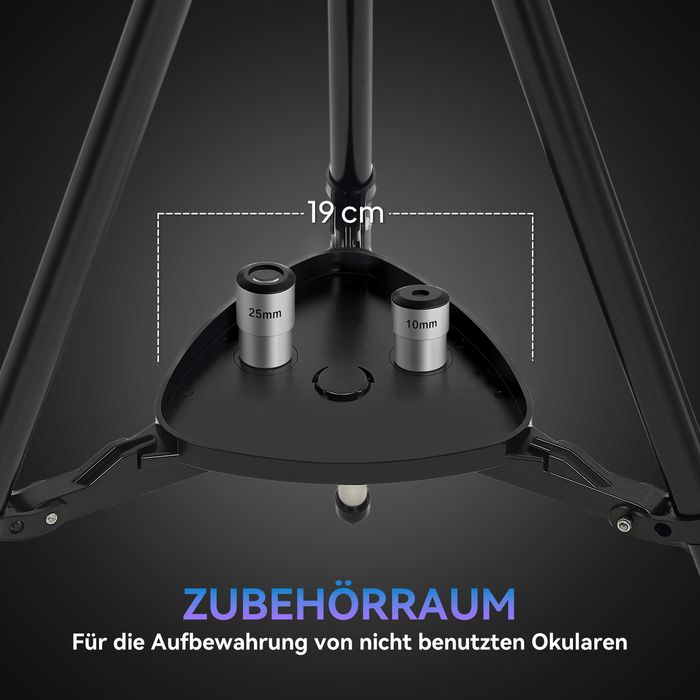- Verstellbares Stativ: Das aus Edelstahl gefertigte, verstellbare Stativ gewährleistet bei zwei unterschiedlichen Höhen (120, 75 cm) einen stabilen Blick und dient als verlässliche Basis für klare und angenehme Beobachtungen. Ausgerüstet dieses Teleskop mit einem Ablagefach für momentan nicht benötigte Okulare.