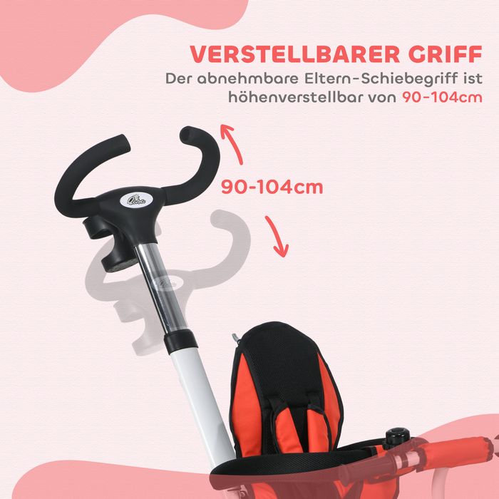 6-in-1 Kinderdreirad mit Schiebestange, Dach, Gurt, Ablagekorb, 18+ Monate, Rot
