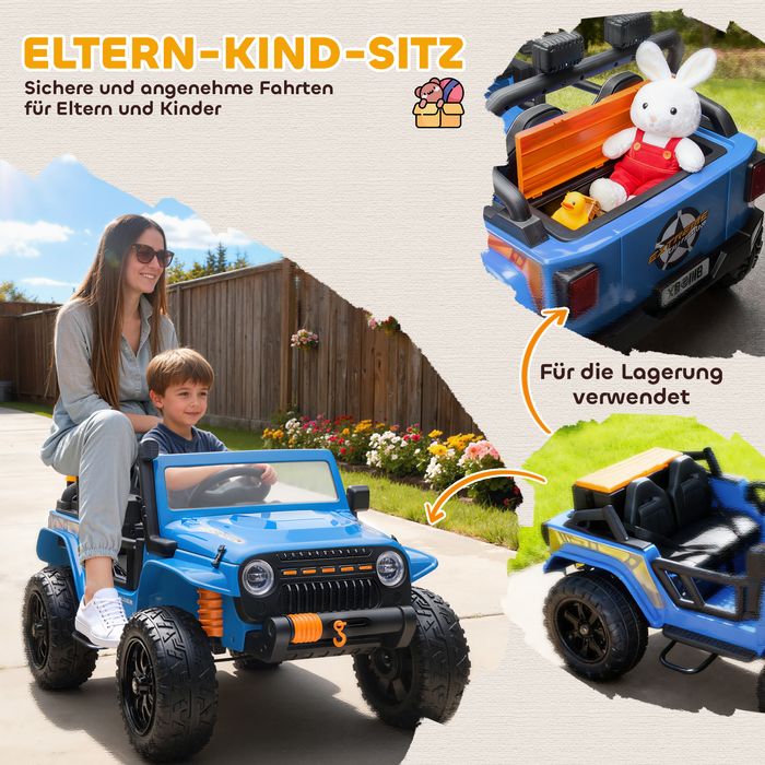 Elektrofahrzeug für Kinder, 12V Batterie, mit Eltern-Kind-Sitz, fernsteuerbar, Musik, Hupe, LED, 3-8 Jahre, Blau