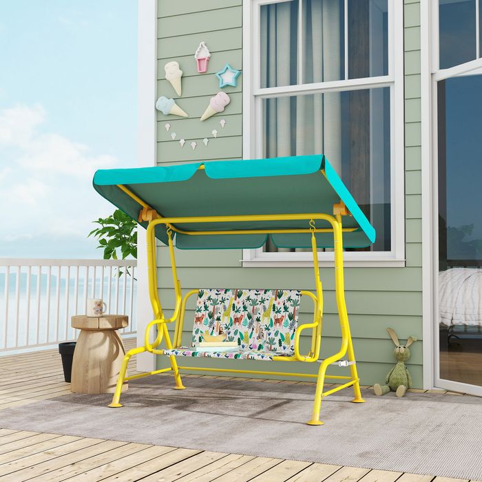 Erleben Sie das Vergnügen entspannter Stunden im Freien mit der 2-Sitzer-Schaukel. Sie verfügt über ein abnehmbares, verstellbares Sonnendach, das Ihre Kinder schützt, ideal für Garten oder Poolbereich. Der robuste Stahlrahmen mit rutschfesten Füssen sorgt für Sicherheit, das reizende Regenbogen-Design für Spass. Perfekt für gemeinsame Schaukelabenteuer von Kindern!