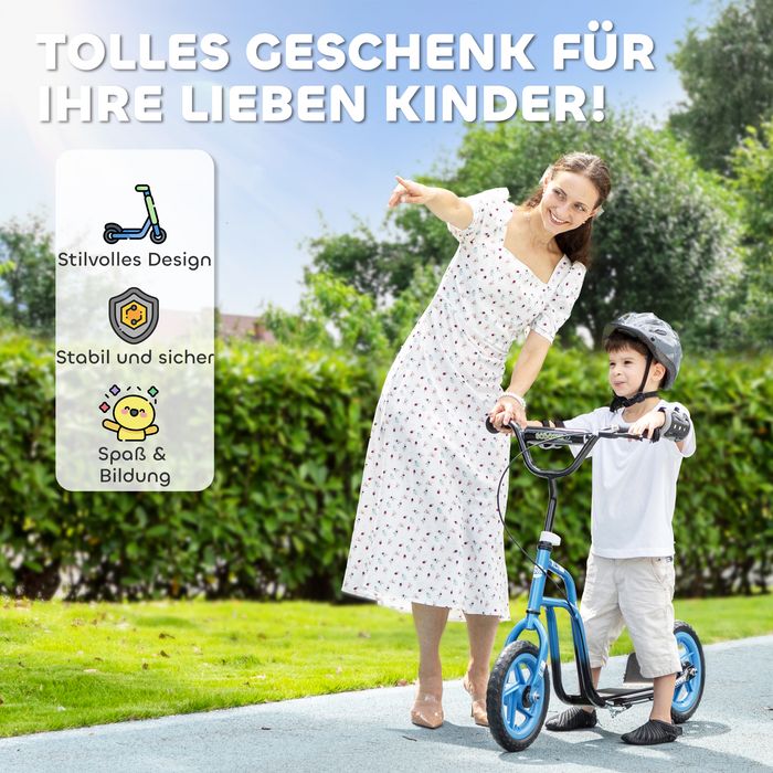 Kinderroller mit verstellbarem Lenker, grosse Räder, Parkständer, Handbremse, 5-12 Jahren, Blau